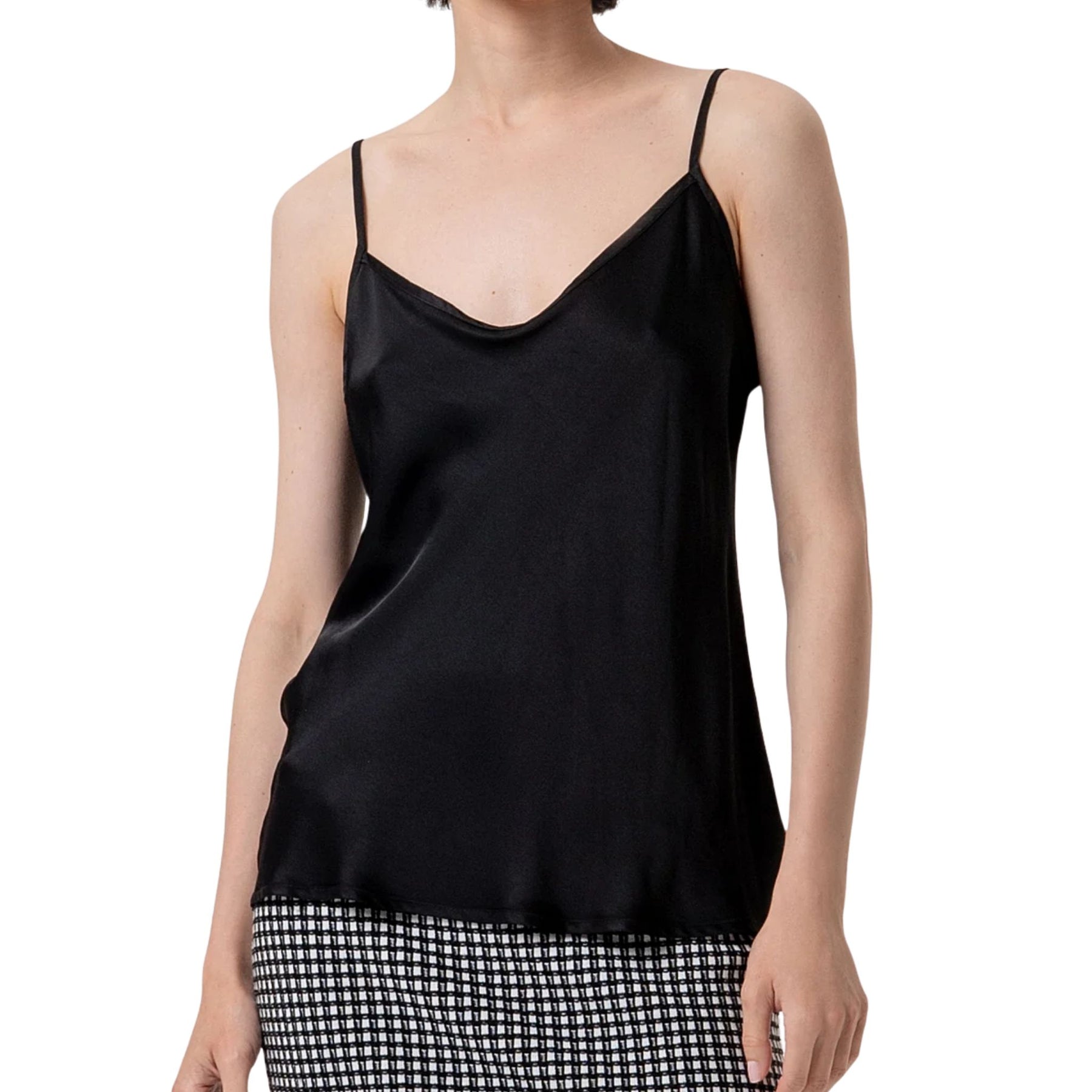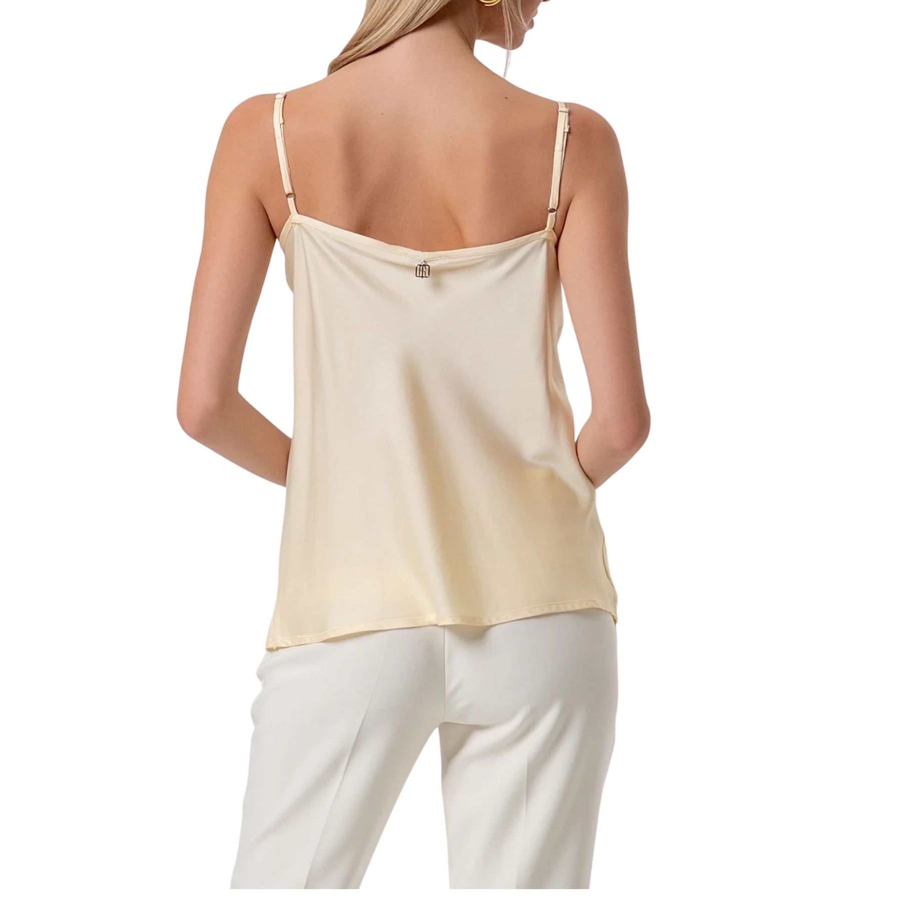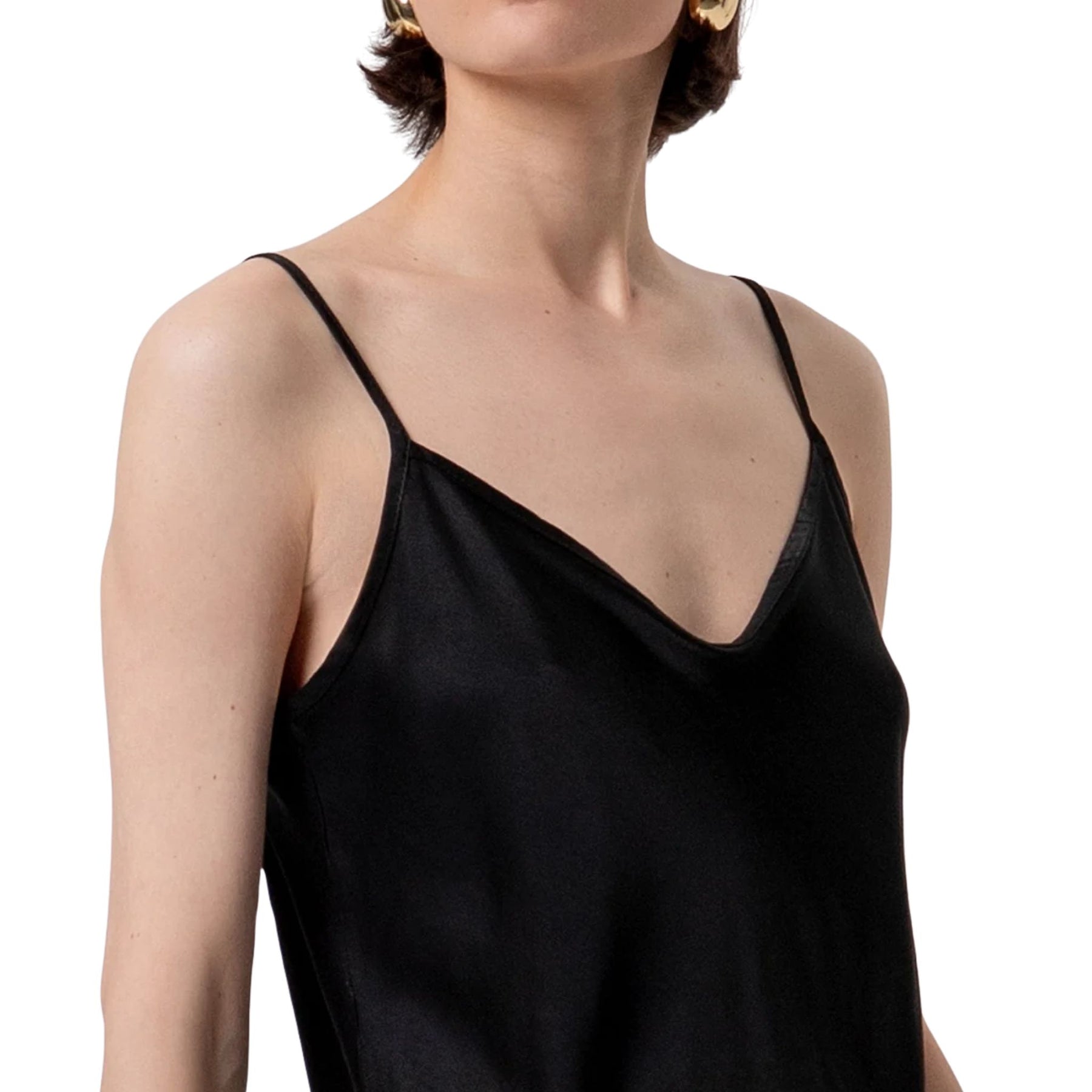 Top senza maniche in raso di viscosa, scollo a V, e con bretelline sottili.