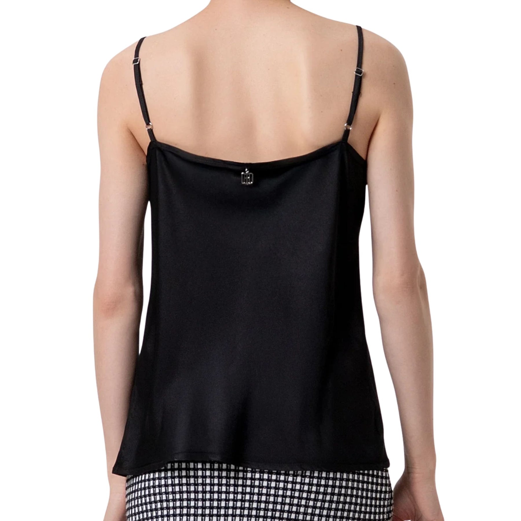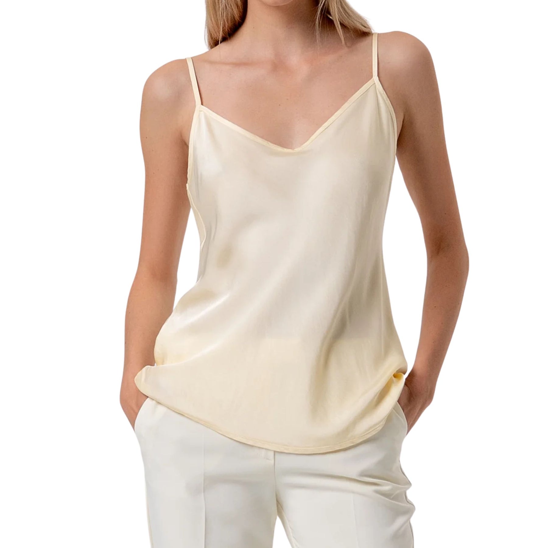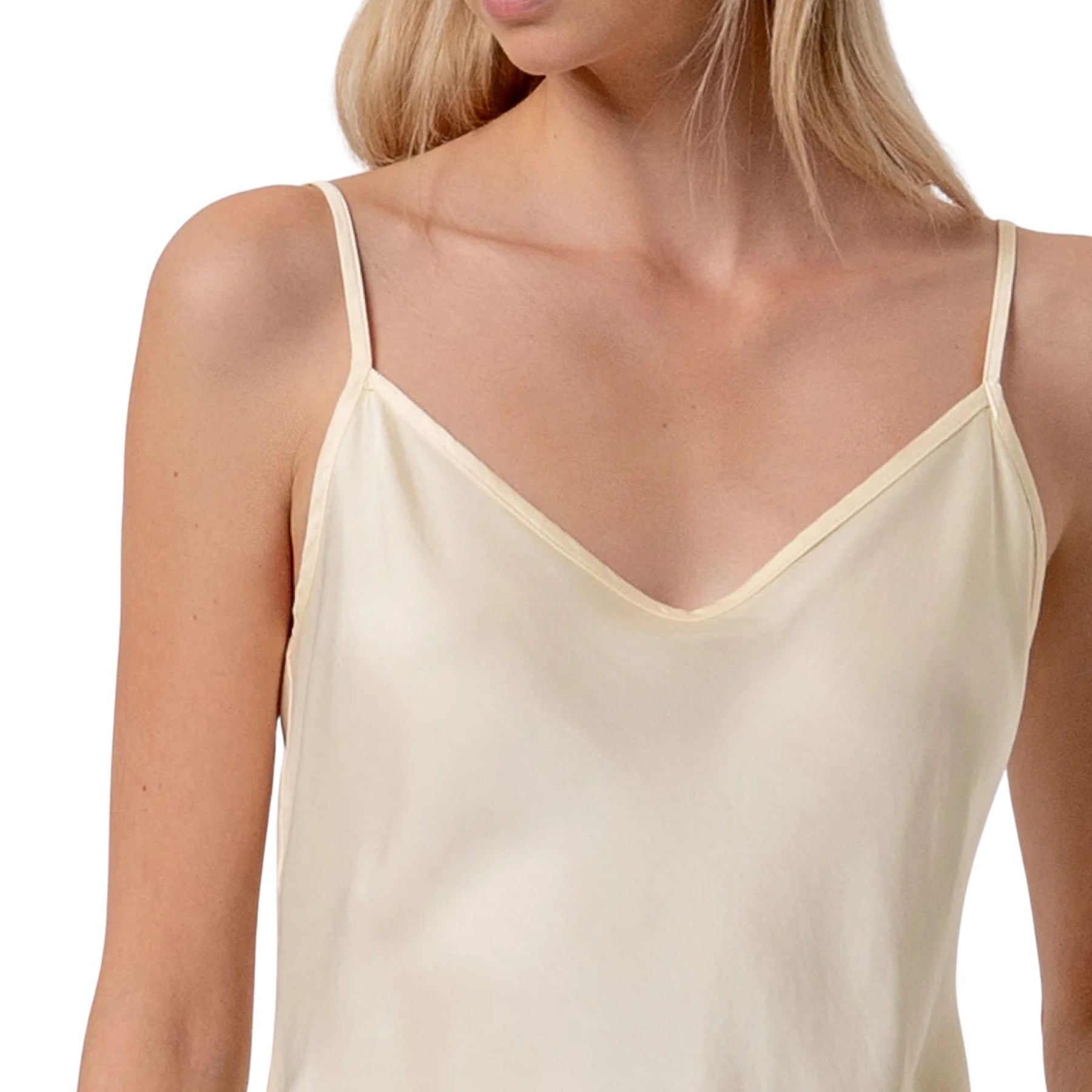 Top senza maniche in raso di viscosa, scollo a V, e con bretelline sottili.