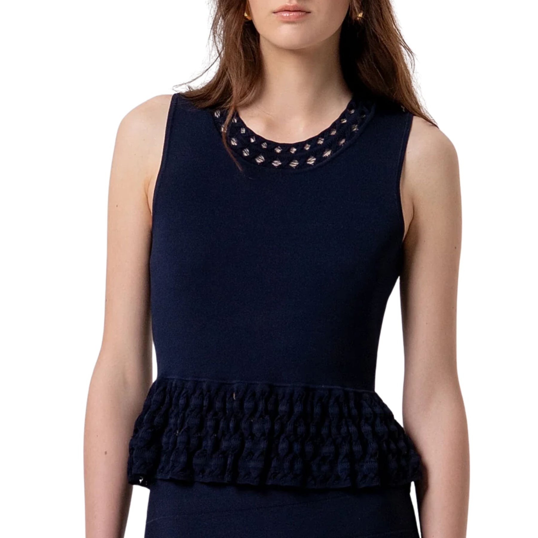 Scollo rotondo arricchito da un’applicazione gioiello composta da file di strass brillanti, che illuminano il viso e sostituiscono l'esigenza di una collana. La silhouette è resa moderna e decisa grazie alle spalline strutturate e leggermente imbottite, che donano una forma architettonica al capo e definiscono il profilo in modo impeccabile.